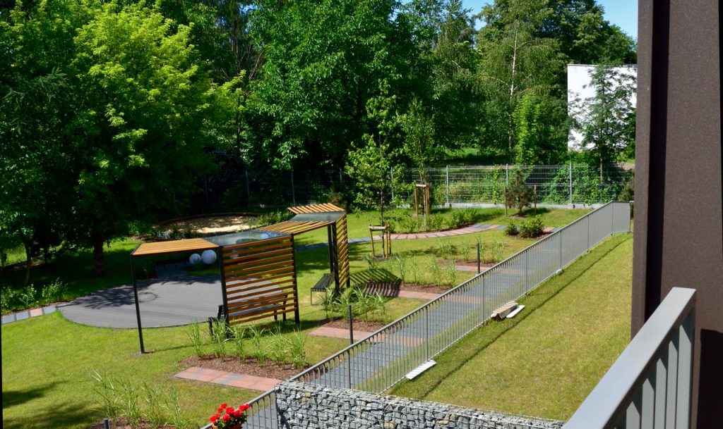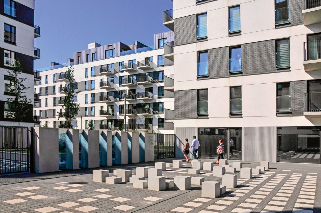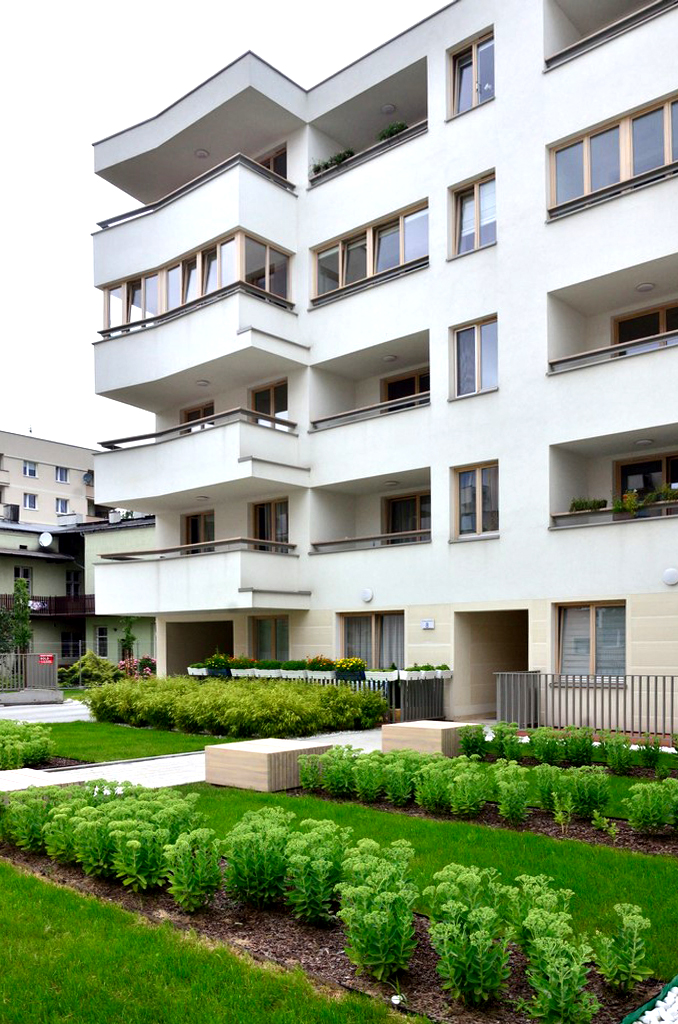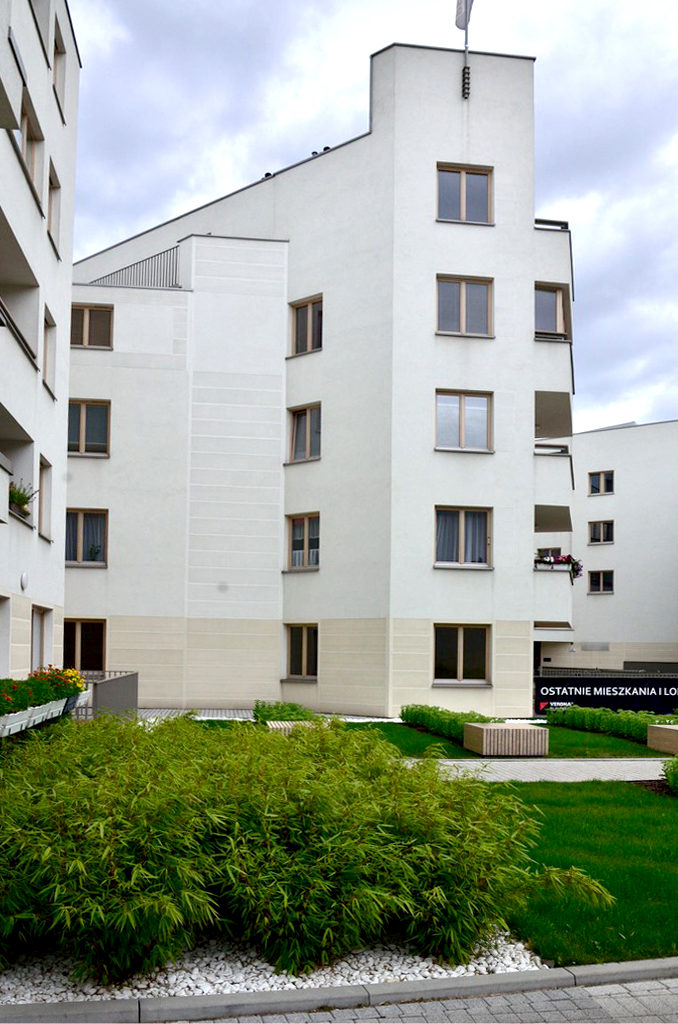 - designerskie zastosowanie materiałów wykończeniowych połączone z dbałością o wysoką jakość detalu architektonicznego w wewnętrznych przestrzeniach wspólnych budynków, dbałość o zewnętrzne przestrzenie wspólne, zrealizowane przy zastosowaniu atrakcyjnego zestawu elementów małej architektury ogrodowej i zieleni ogrodowej