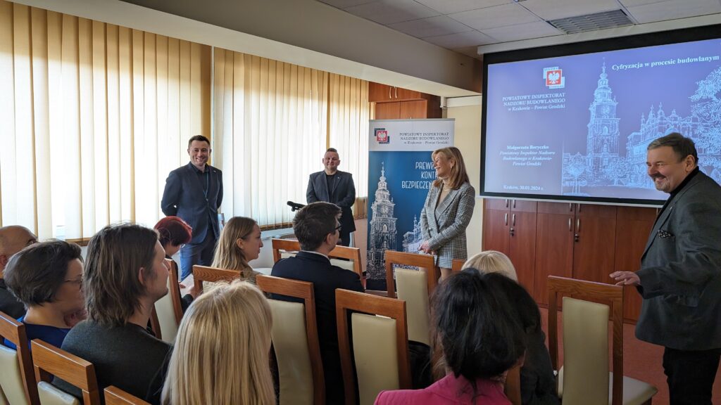 We wtorek 30 stycznia br. ponad 40 Członków SBDiM wzięło udział w szkoleniu przeprowadzonym przez Powiatowy Inspektorat Nadzoru Budowlanego. Pierwszą część, dotyczącą procesu cyfryzacji, zaprezentowała Pani Dyrektor Małgorzata Boryczko, natomiast drugą – projekt techniczy – Pan Dawid Wideł p.o. Kierownika Referatu I Orzecznictwa i Kontroli w PINB.